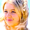 Description: A young blonde woman looking to the left and smiling close-mouthed